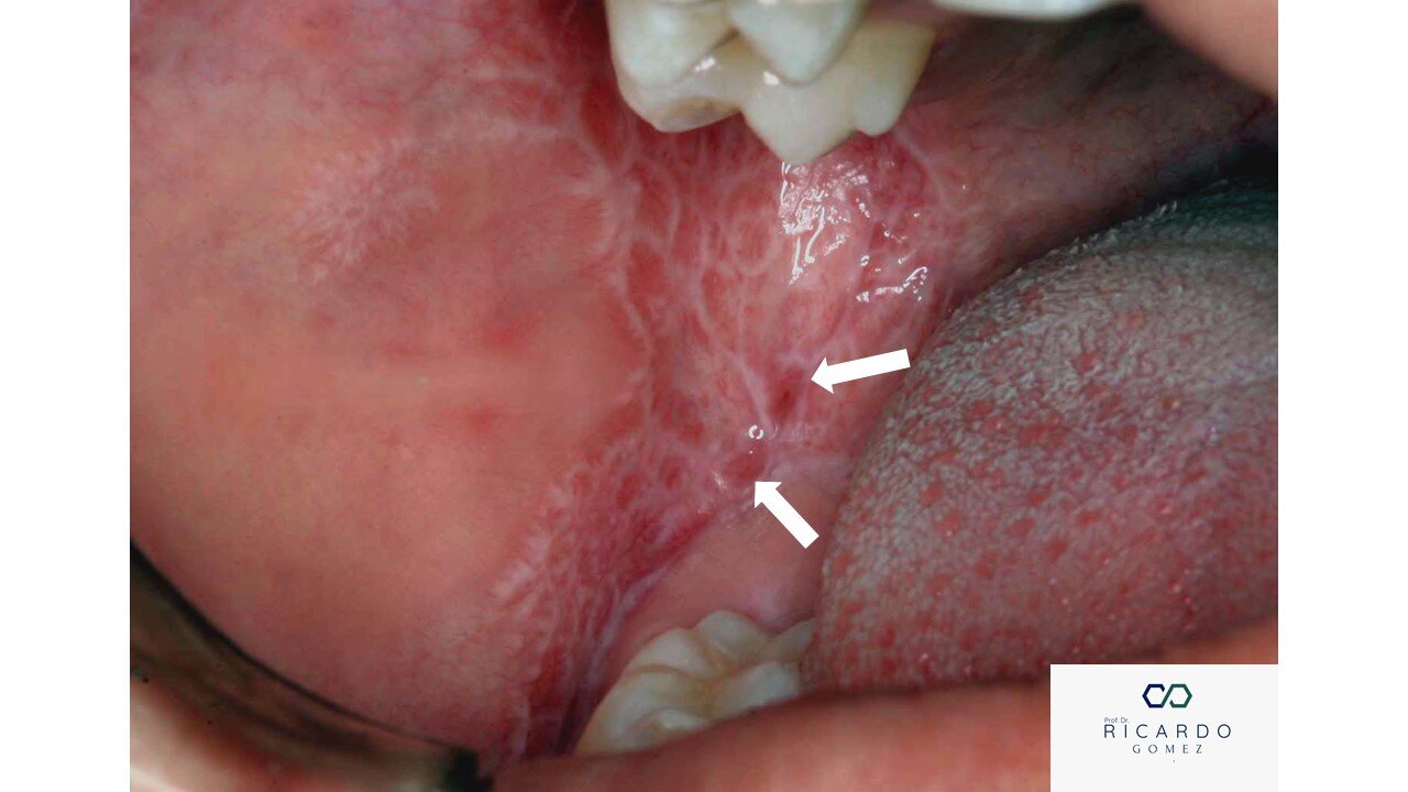 Figura 2: Líquen plano erosivo. As setas indicam áreas erosivas intercaladas por outras exibindo linhas hiperqueratóticas. Essas áreas são de escolha para biópsia nesses casos.
